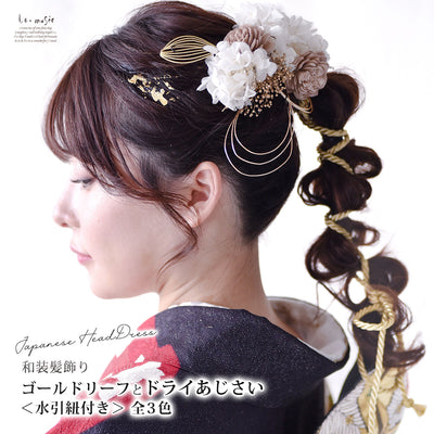 和装 成人式 ドライフラワー 髪飾り 金箔 ゴールド リーフとドライあじさい < 水引 紐 付き>